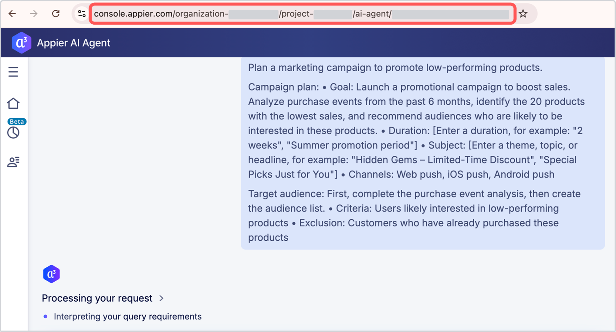 | 1 | Enable Appier AI Agent. | Contact your customer success manager to enable Appier AI Agent for your organization. |