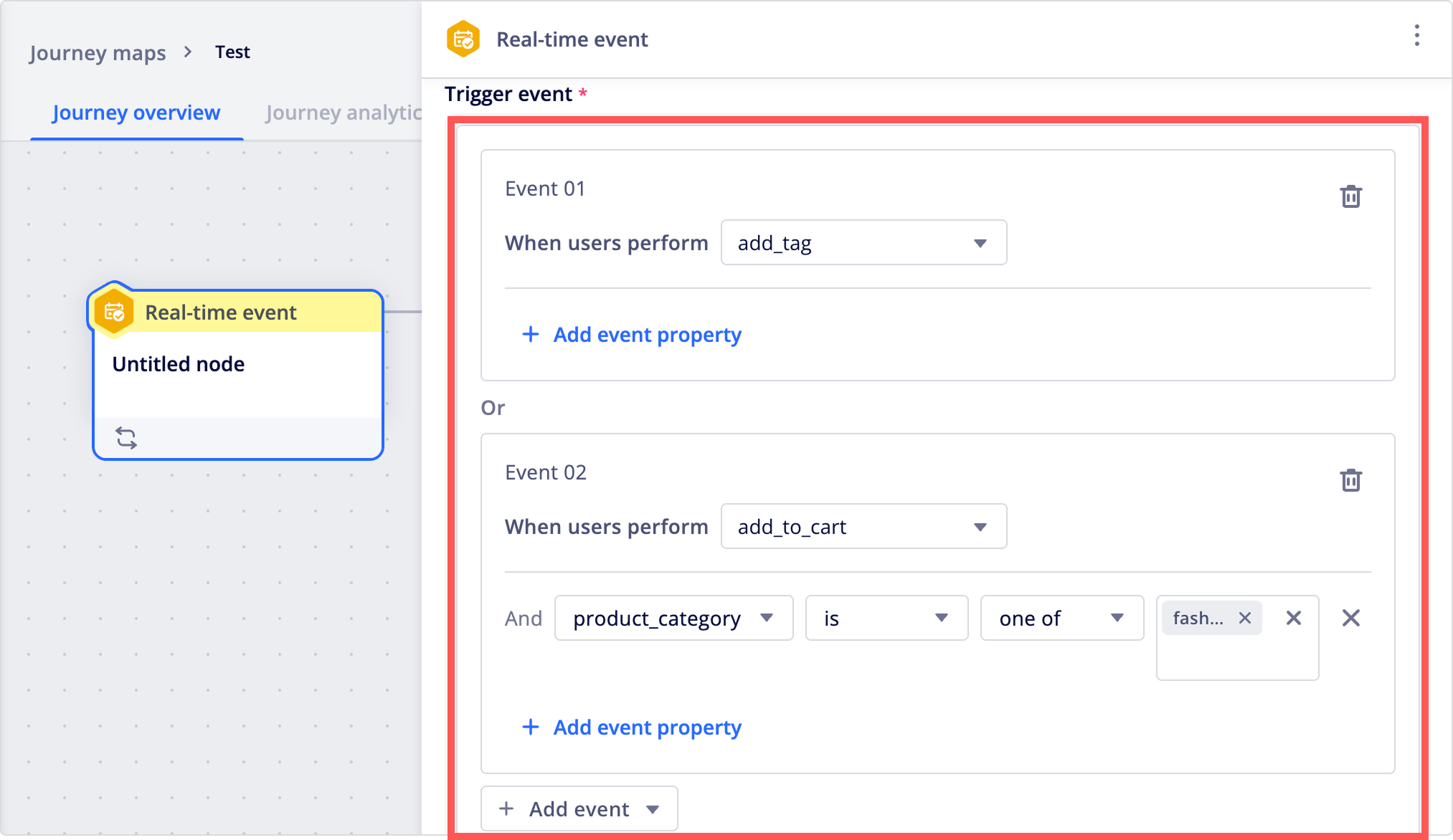 You can specify up to 10 events within the entry node to serve as entry triggers. Users who complete any of the specified events will immediately enter the journey. Note that: