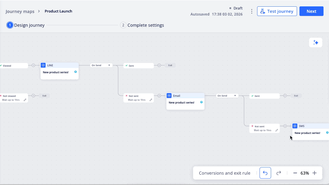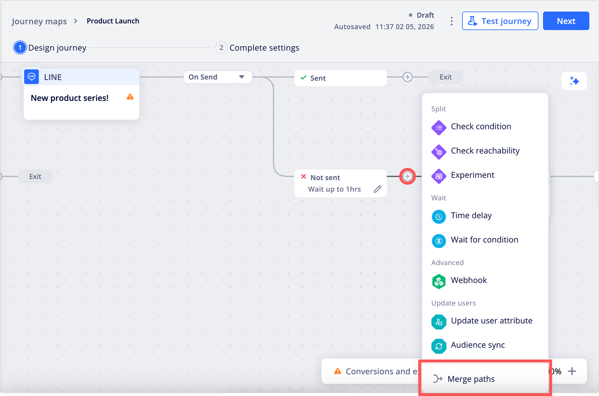 The merge paths feature allows you to reconnect split paths generated by message node back into a single path. By routing users from different paths (such as Sent or Not sent) to a shared next step, you can simplify your journey map and avoid creating duplicate nodes.