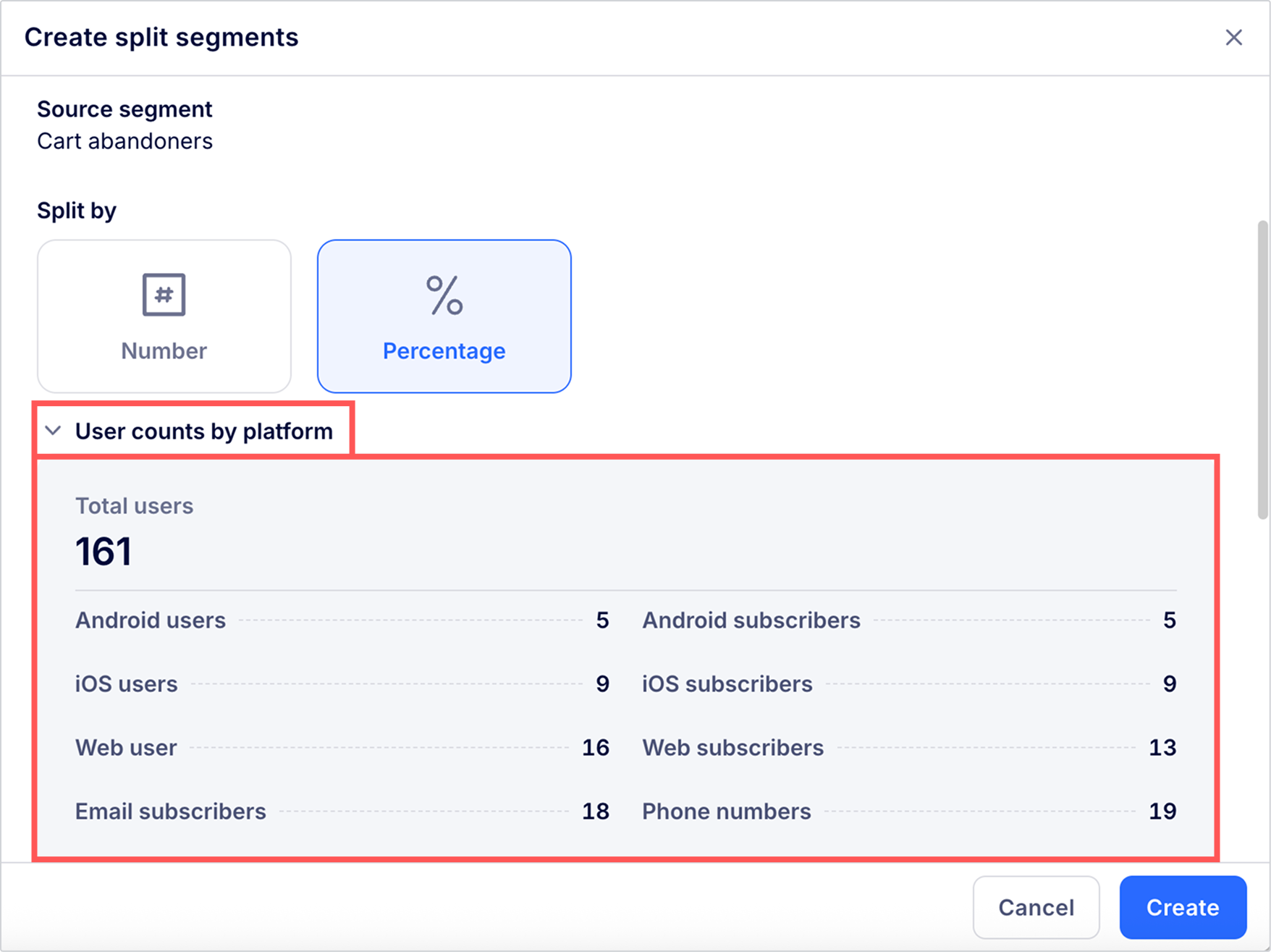 Review user countsClick User counts by platform to view the number of users in the source segment by platform.
