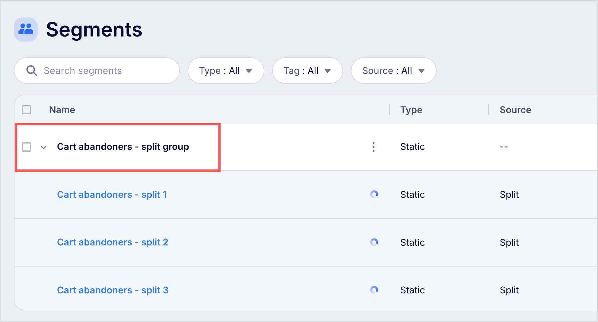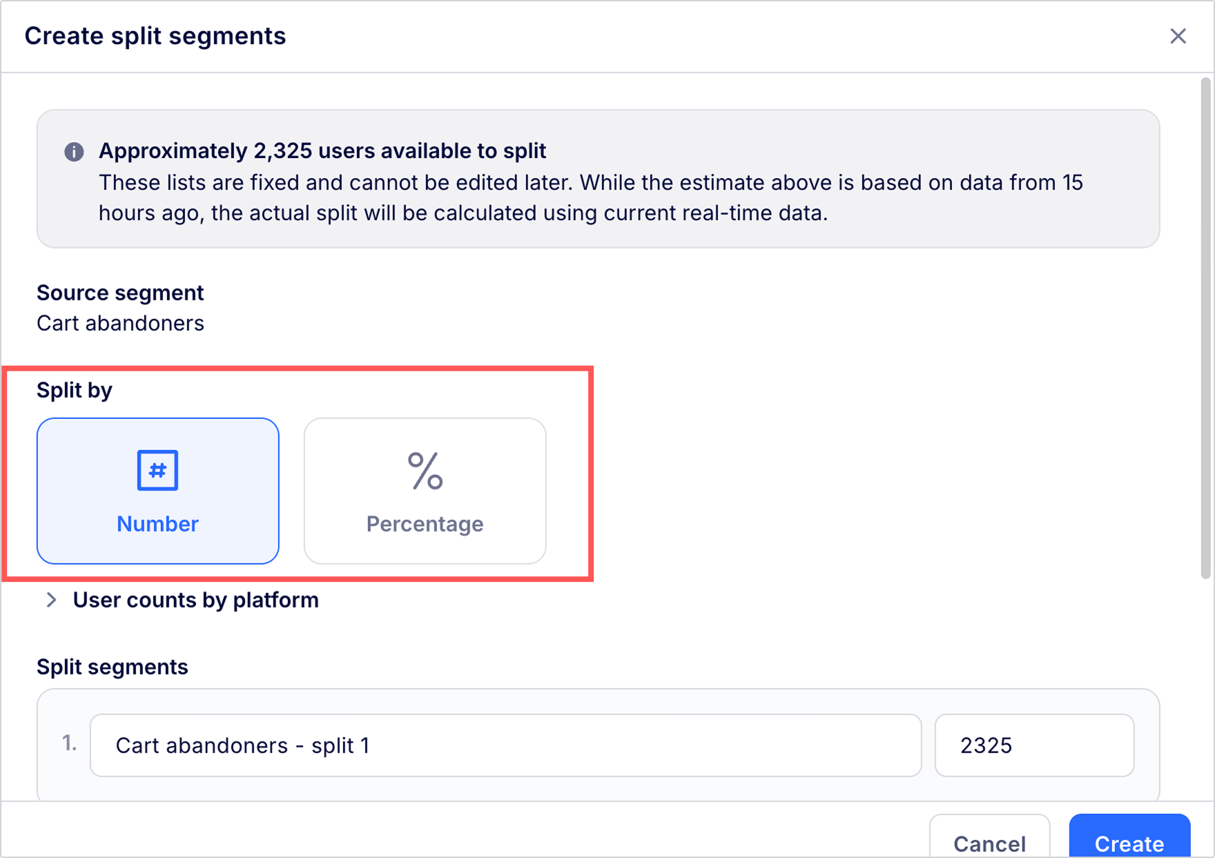 - Percentage: Enter the percentage of users from the source segment to add in each segment.
