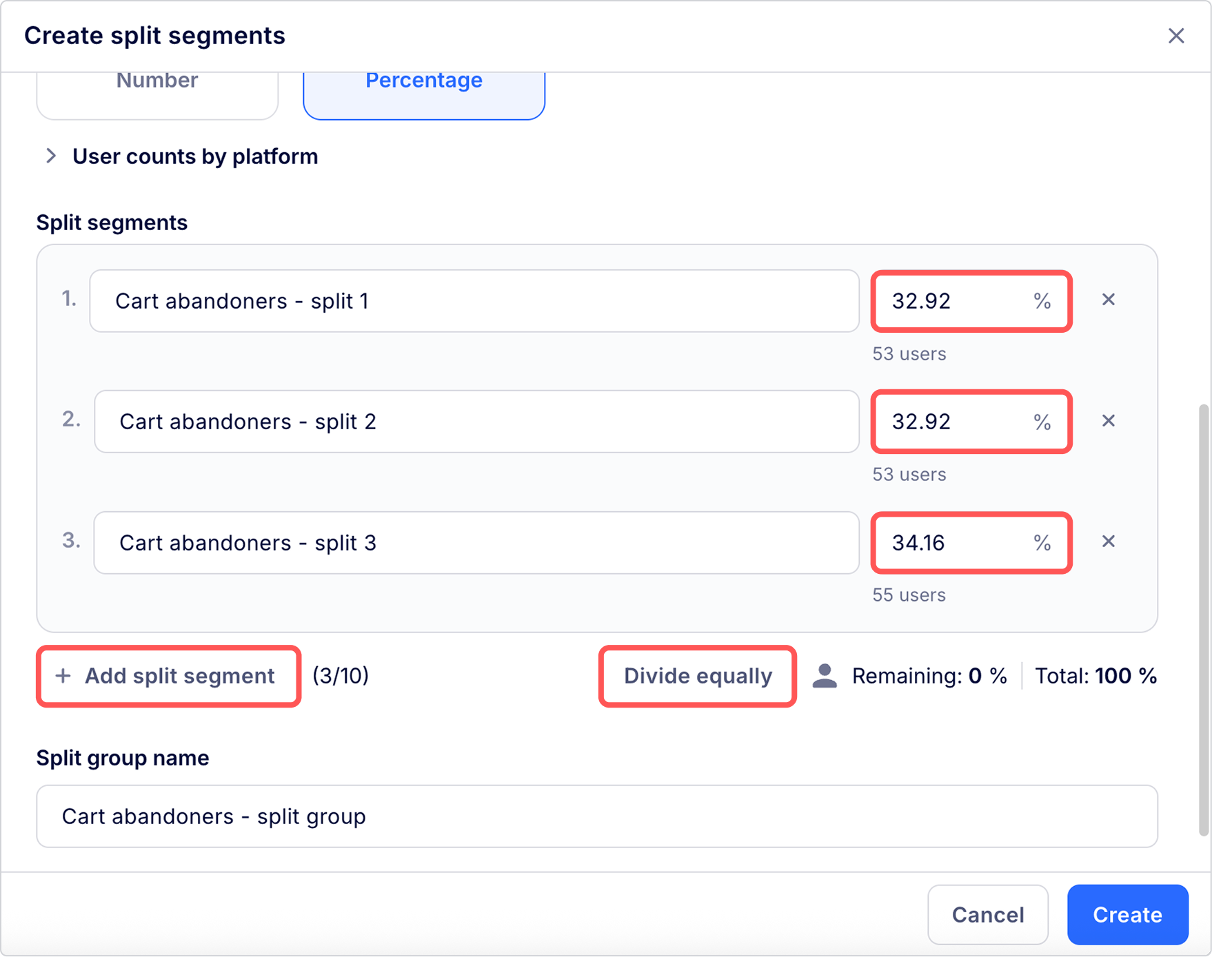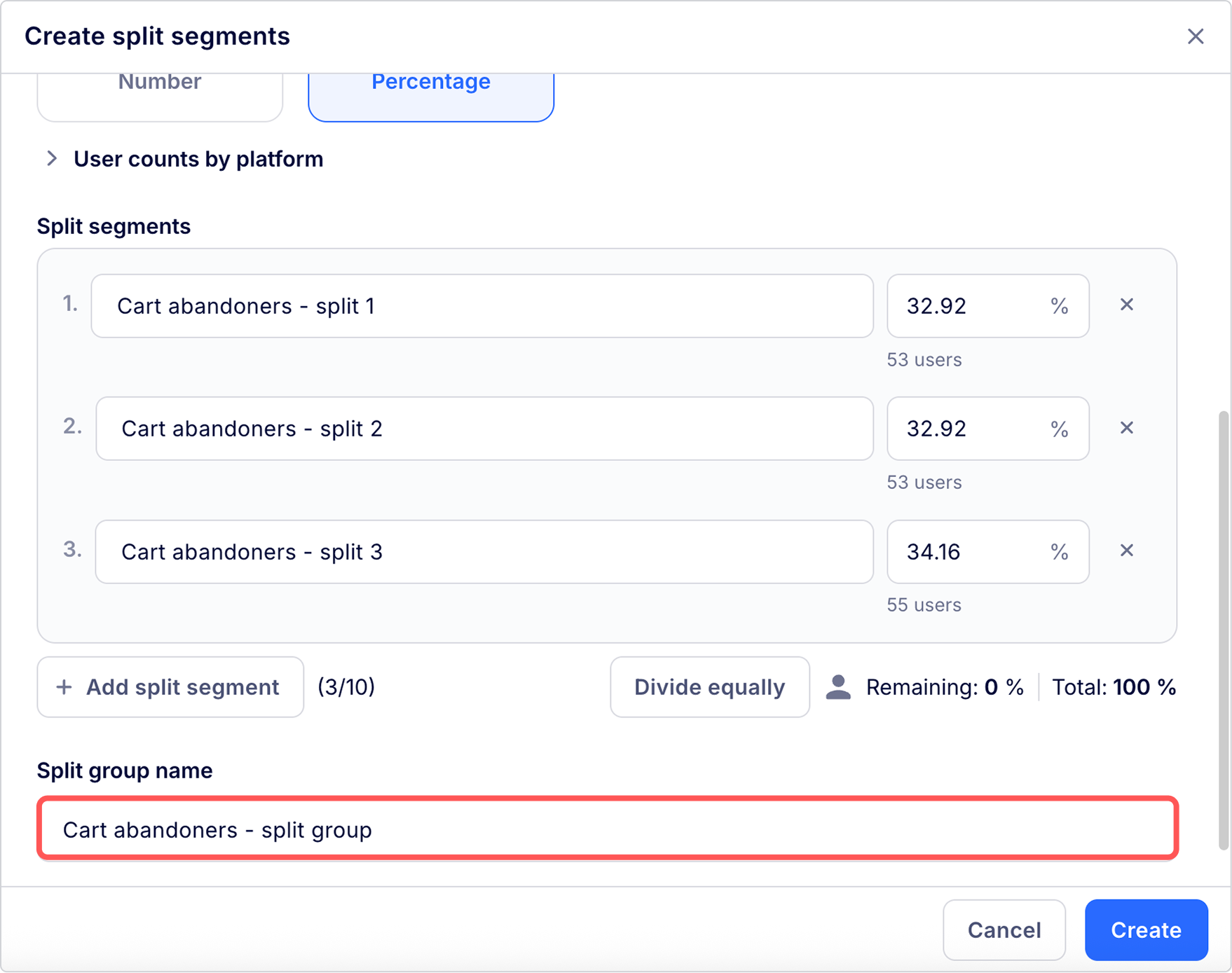 - Enter the number or percentage of users to allocate to each split segment. To divide users evenly across all segments, click Divide equally.