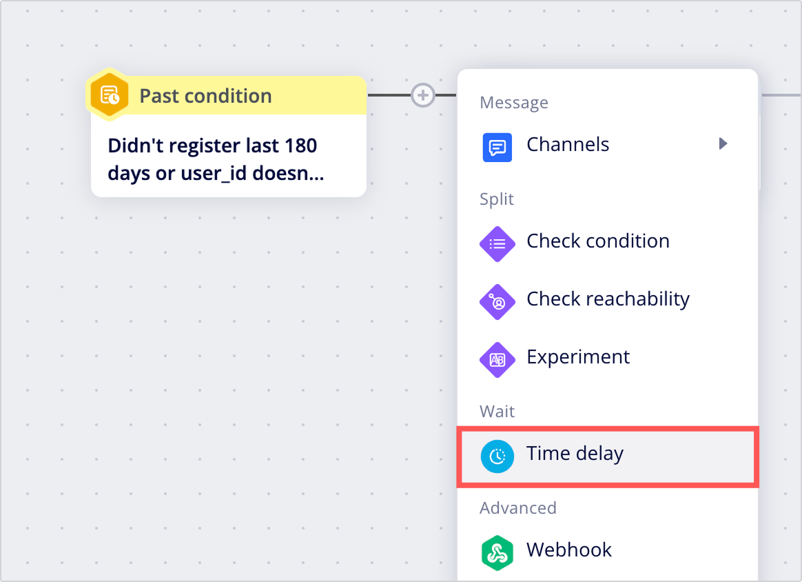 To add a wait node, click the circle in between nodes and select Time delay.